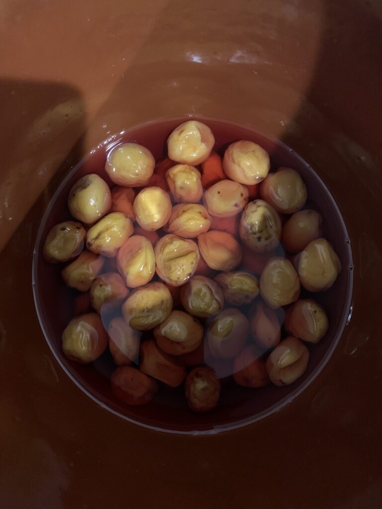 ①農薬を使用していない完熟梅を、好きな濃度の天然塩と一緒に壺や瓶にいれて梅の重さと同じ重しを上からおきます。3日くらい経つと梅酢が上がってきます。